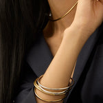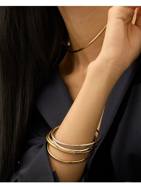 What lightweight stacking dreams are made of. Set of 2 or 5 high-shine gold bangle bracelets. This water-resistant design brings major impact to your stacking game with zero weight. The perfect piece to wear if you don’t intend to take it off. One bangle is finished in high-polish silver, and the other is finished in high-polish 14k gold.