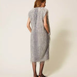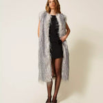 Actitude collection long ostrich feather effect faux fur sleeveless jacket with fadeout print. Front hook fastening, inset side pockets, lining, straight fit.