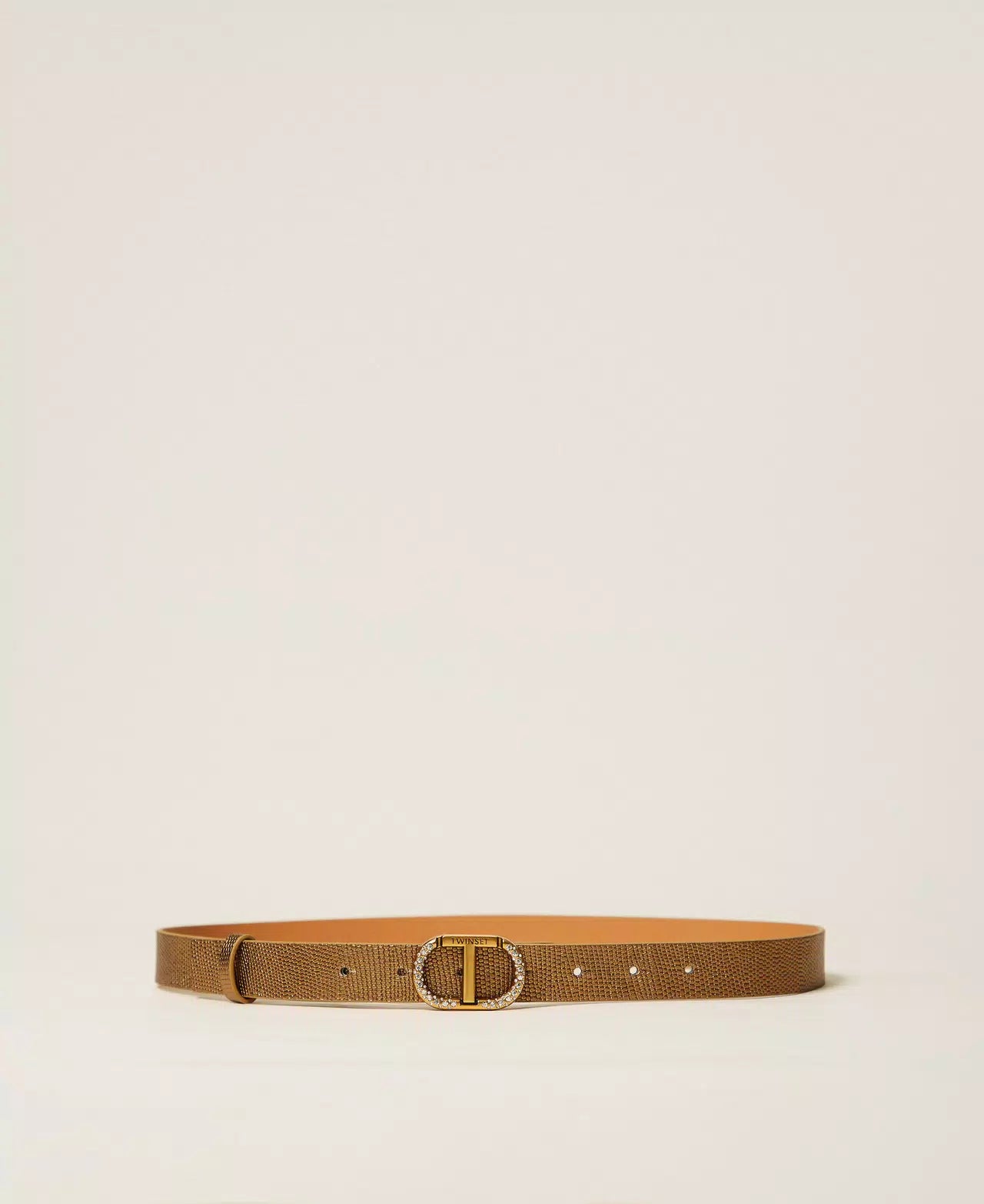 Low waist leather belt with tejus print and faux leather on the inside. Closure with brass Oval T buckle with rhinestones and seven holes