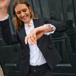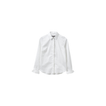 Designed in a sleek, slim silhouette, this piece is made from ultra-soft, stretchable material and features a traditional collar, elegant ruffled cuffs, and a timeless button-up front. Pair it with structured pieces, allowing the charming ruffled cuffs to subtly show from under the sleeves.