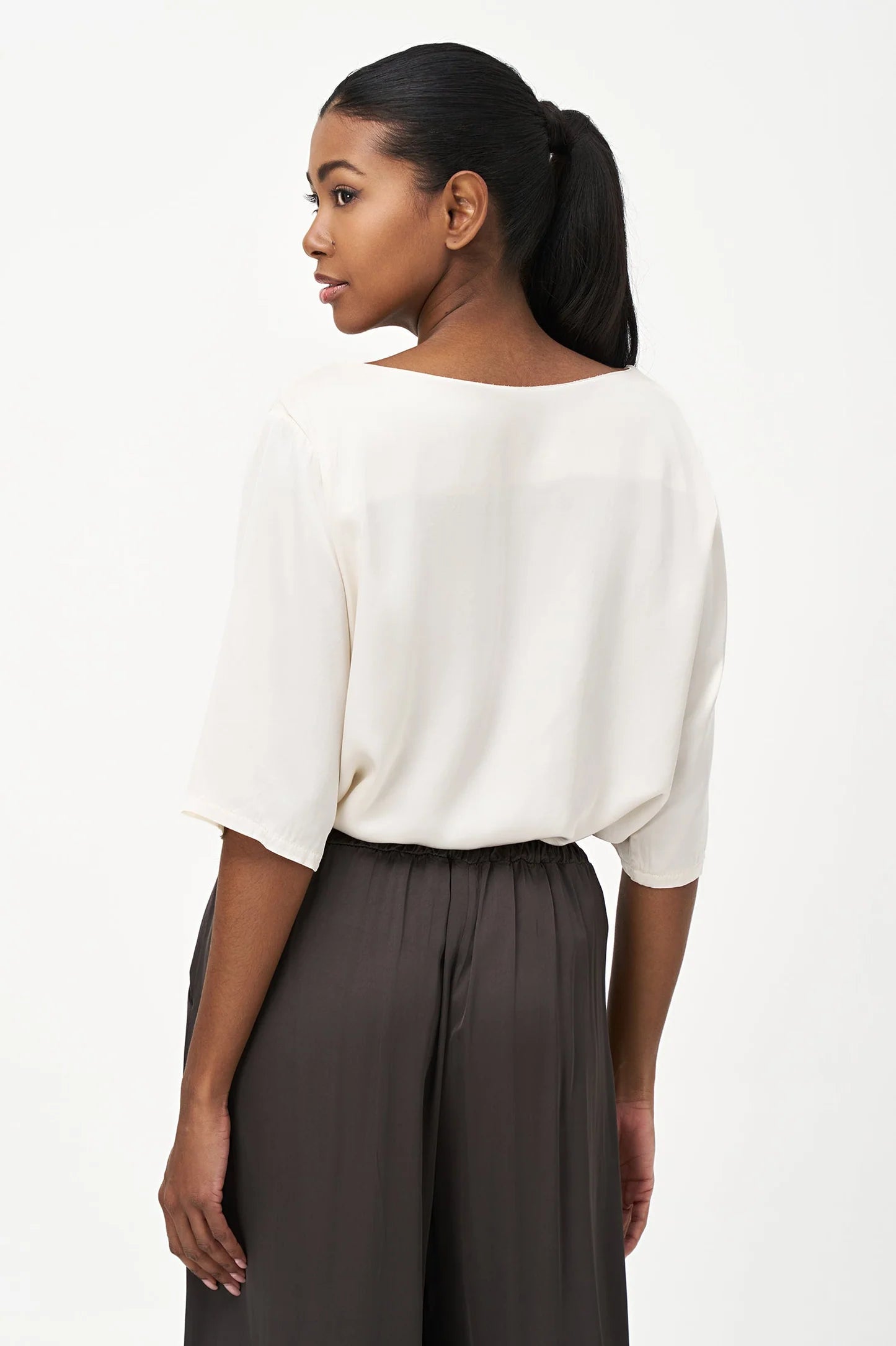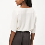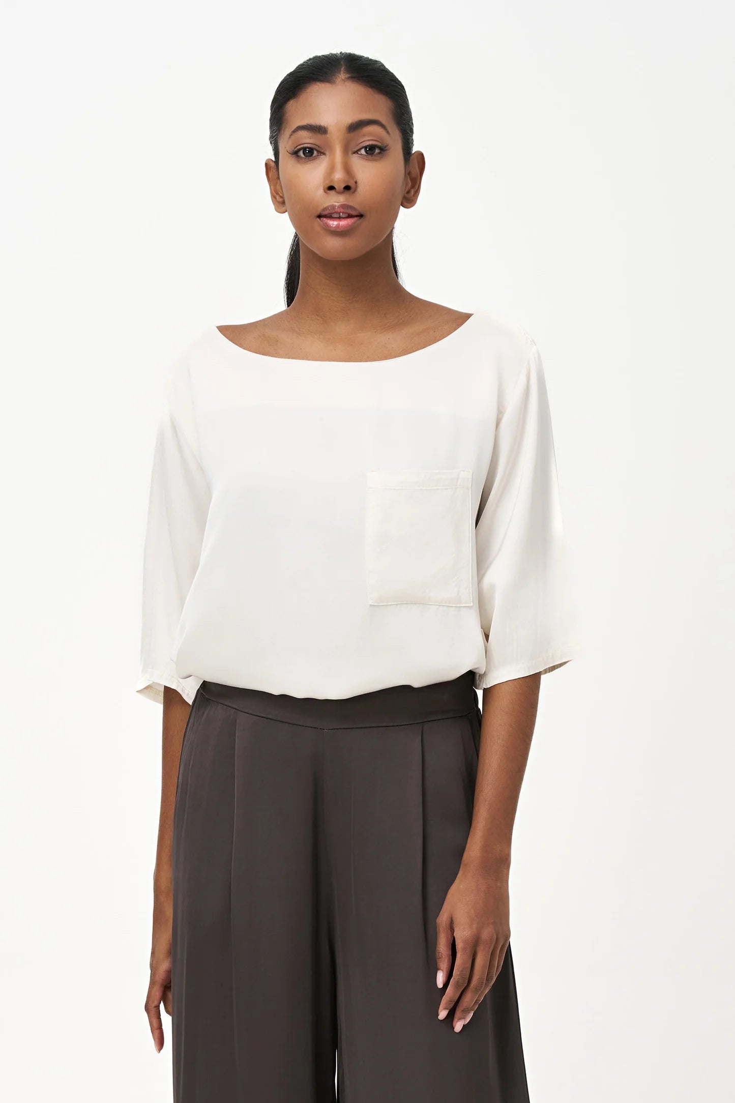 Women's Woven Boat-Neck Top, With Elbow Length Sleeves And A Pocket At The Chest. Made of 100% Viscose.