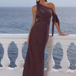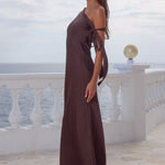 Our Viola Maxi Dress is a unique piece with an asymmetrical neckline that ties at the arm, perfect for a classic look with a twist.