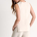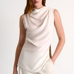 - Elegant and timless draped high boat neckline sleeveless blouse. The fluid fabric falls beautifully, creating a sophisticated silhouette