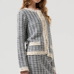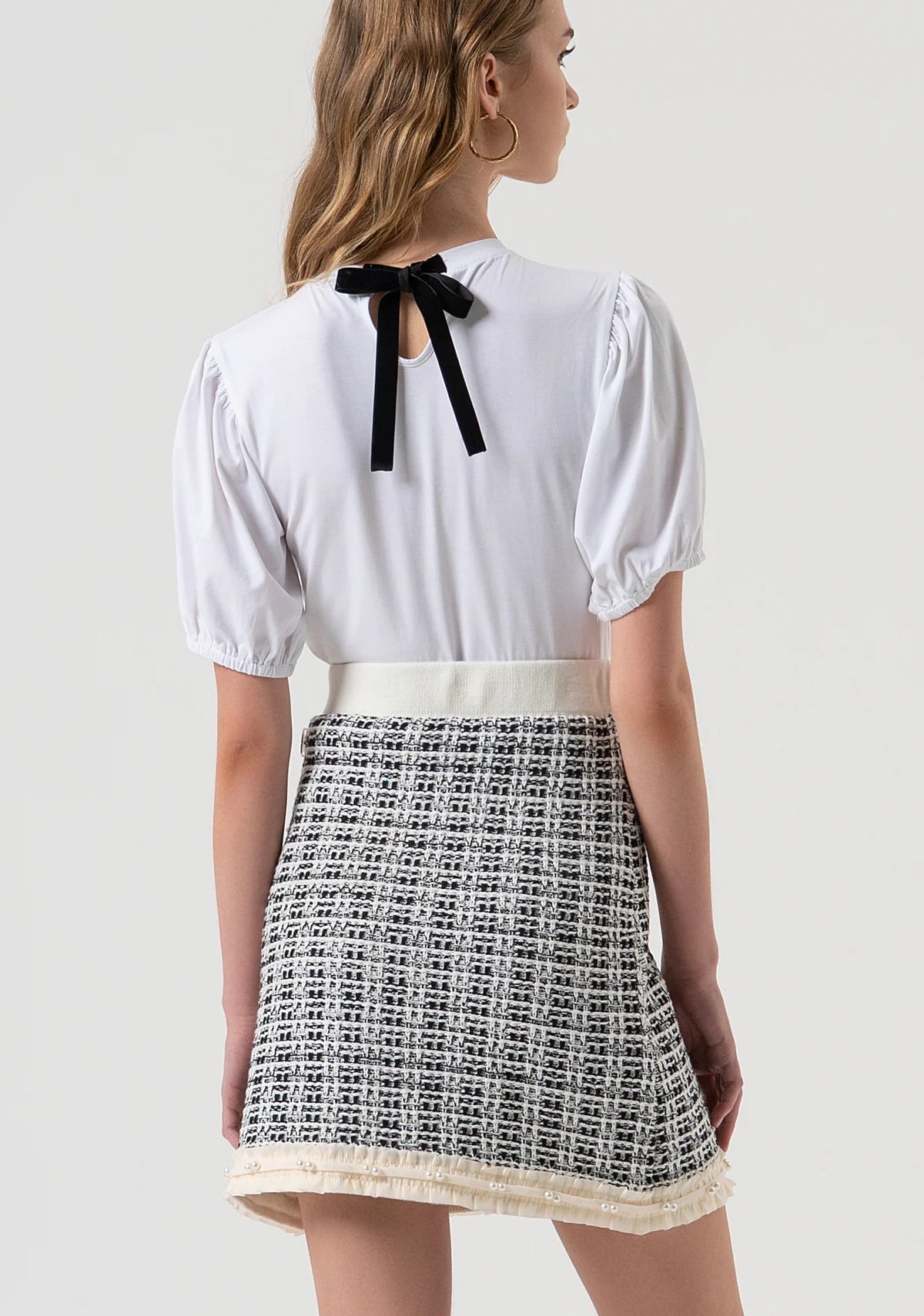 Mini knitted skirt made in tweed. High waist and trimmings at the bottom