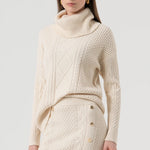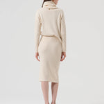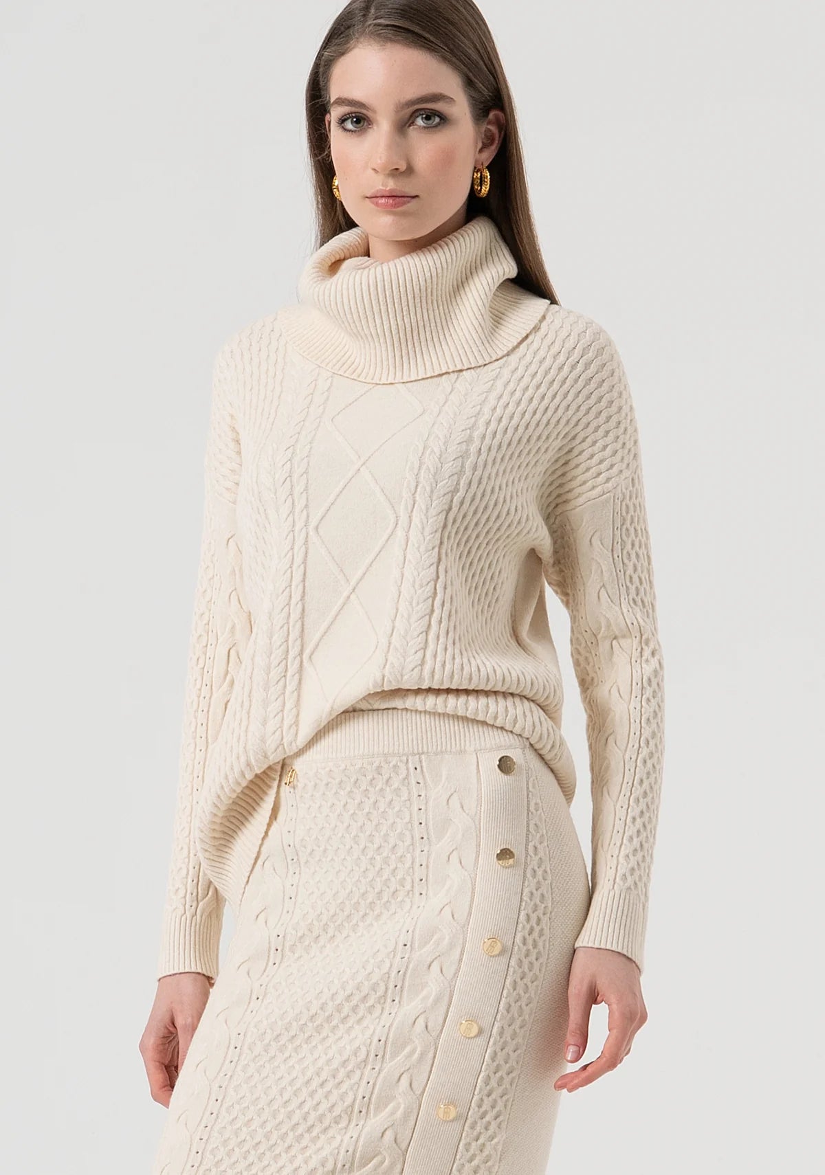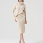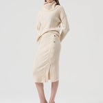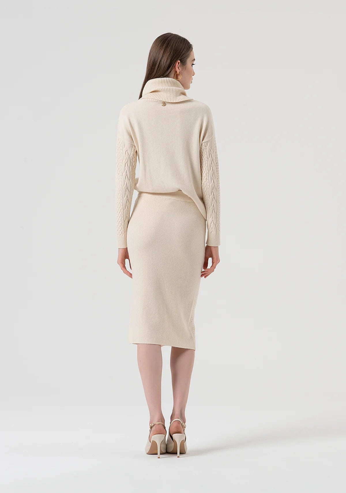 Knitted skirt slim fit middle length with plaits. Regular waist and vent with buttons at the side
