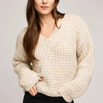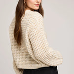 The Willow sweater is made of a lofty yarn in a waffle knit pattern. Features include a v-neckline with a wide rib and a slightly cropped length for easy layering.