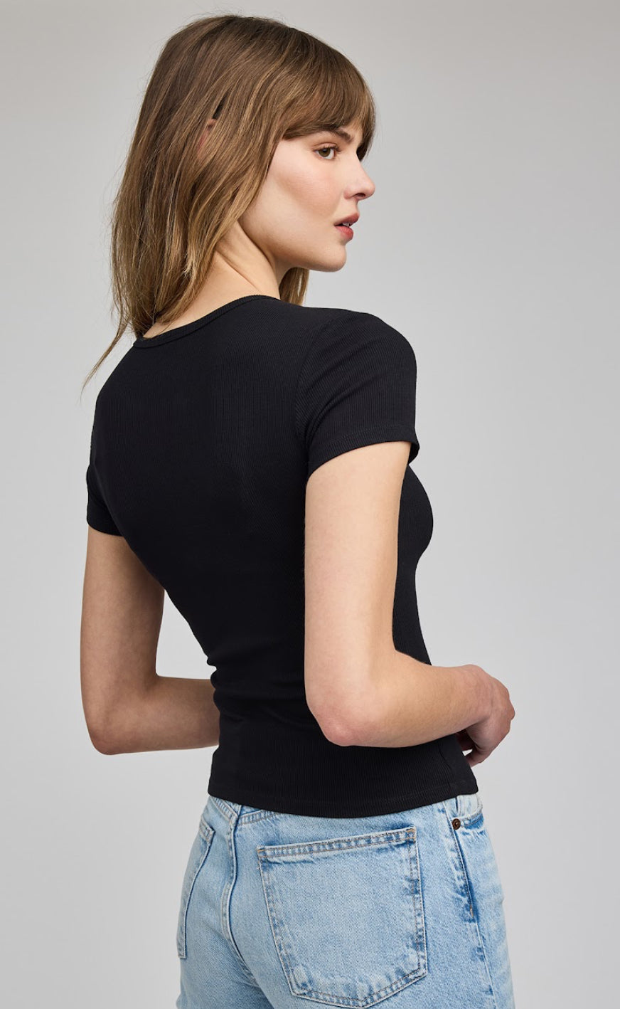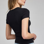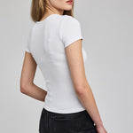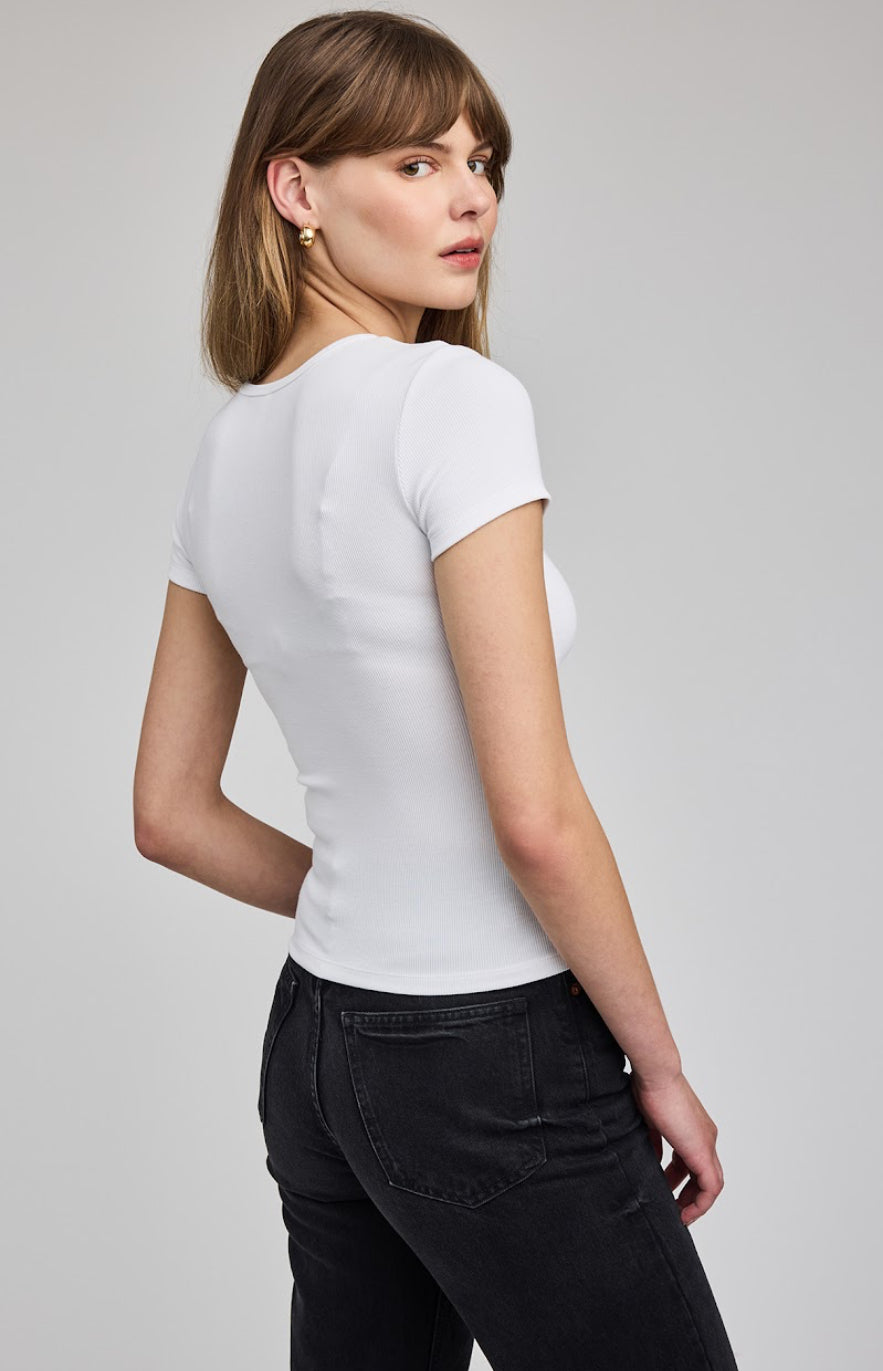 The Reagan t-shirt is made of a stretchy ribbed fabric that hugs the body. The classic crew neck tee is an essential layering piece that you'll want in every color.