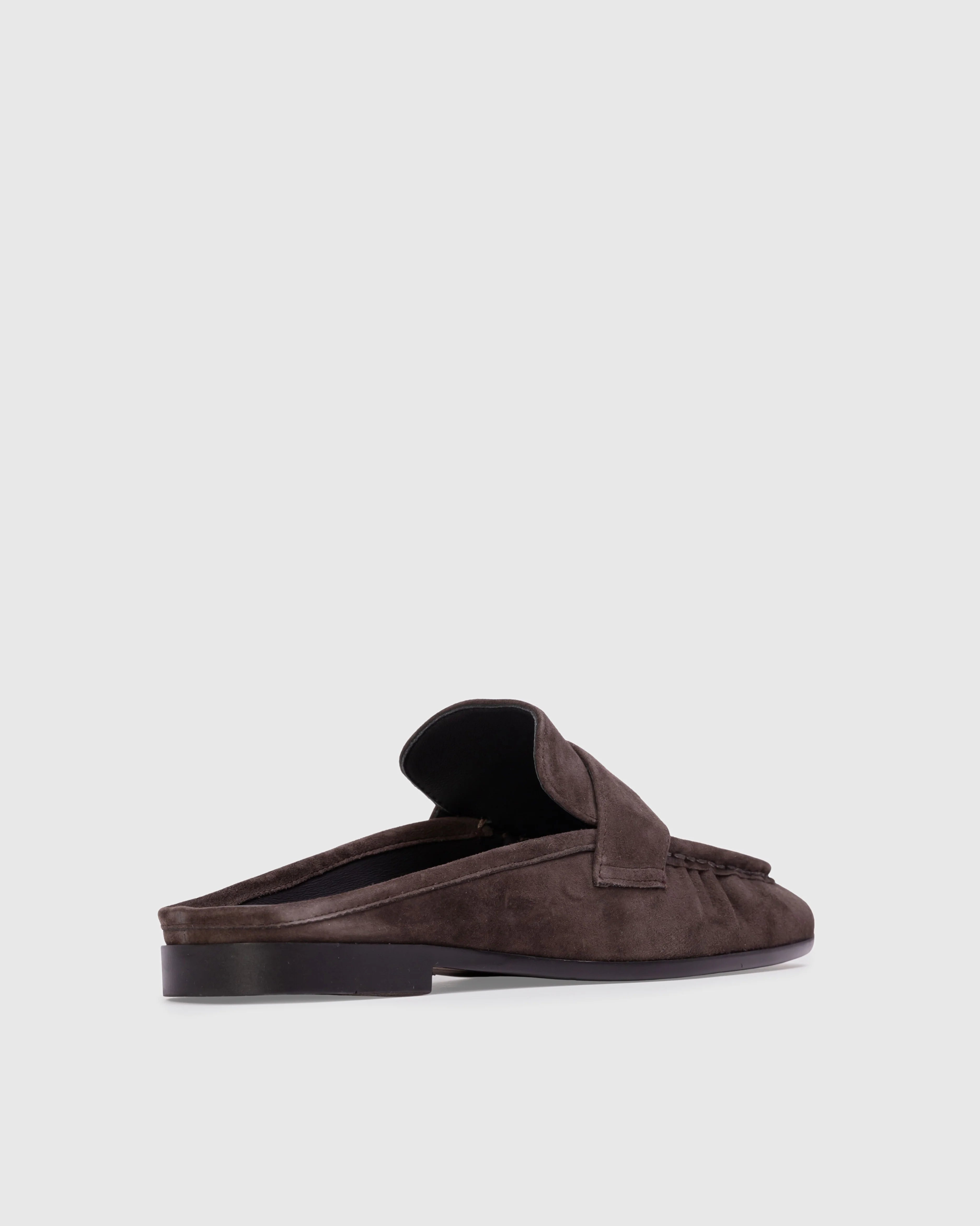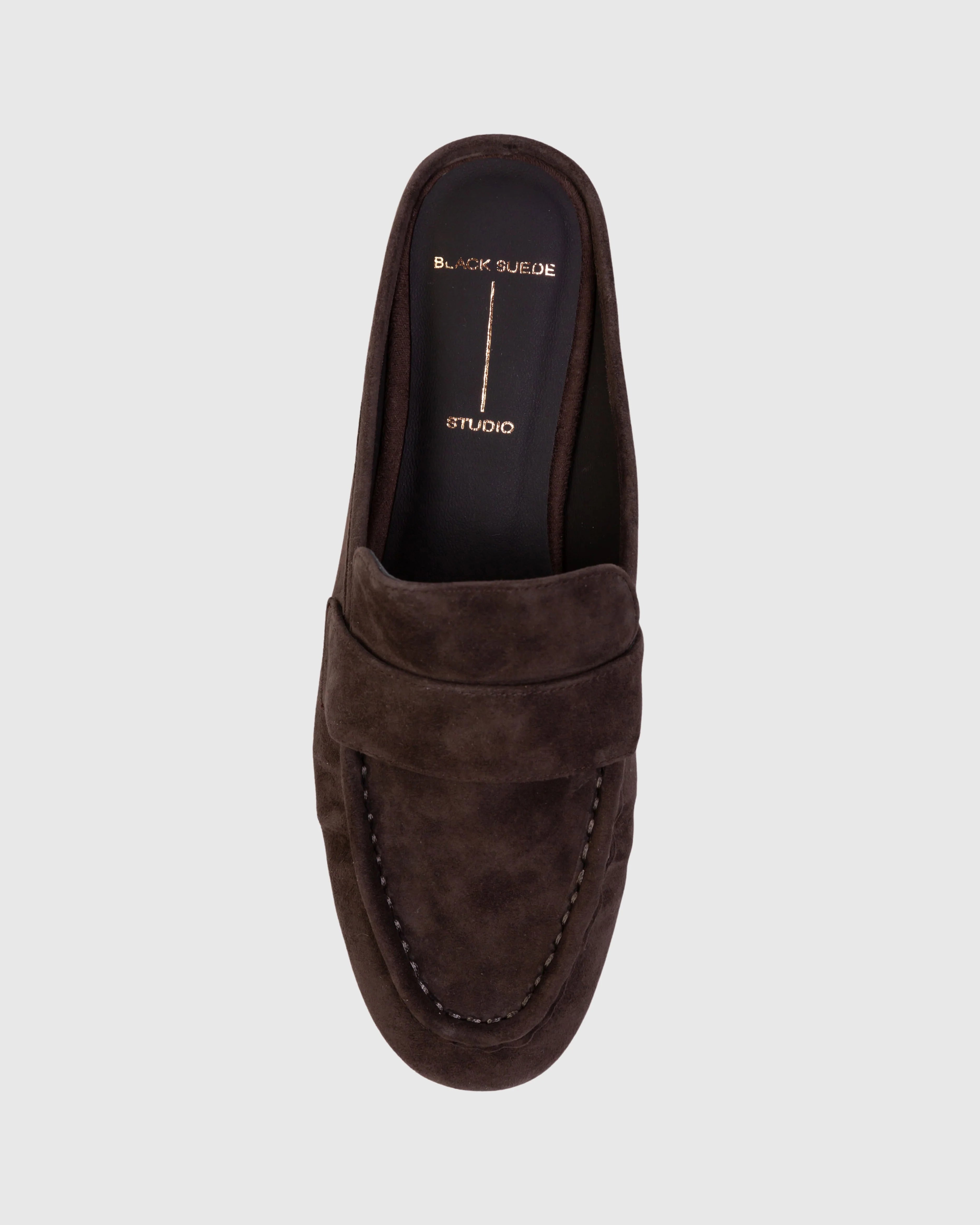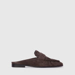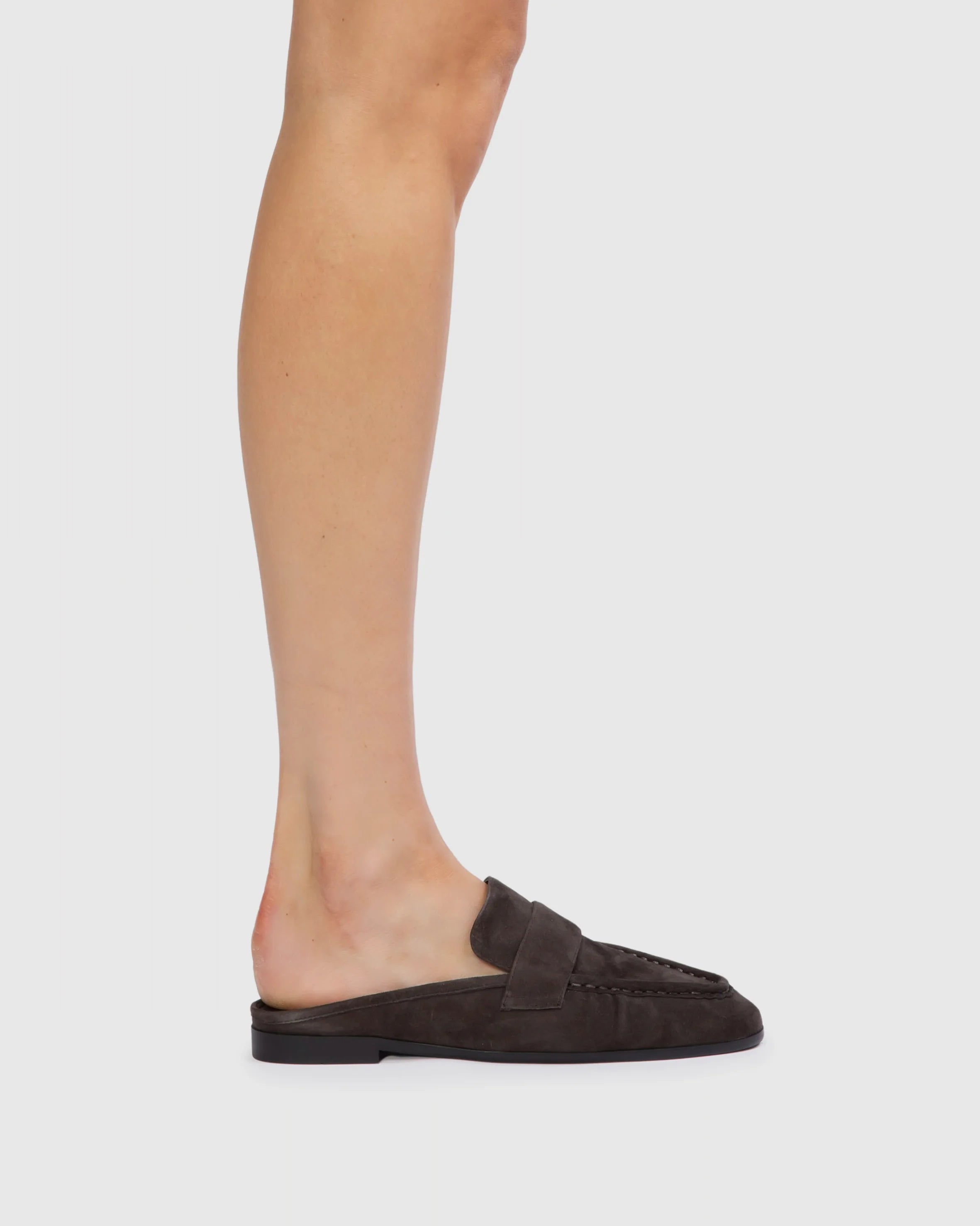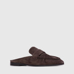 Classic round toe backless slip on loafer. Made with smooth buffed baby calf leather.