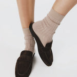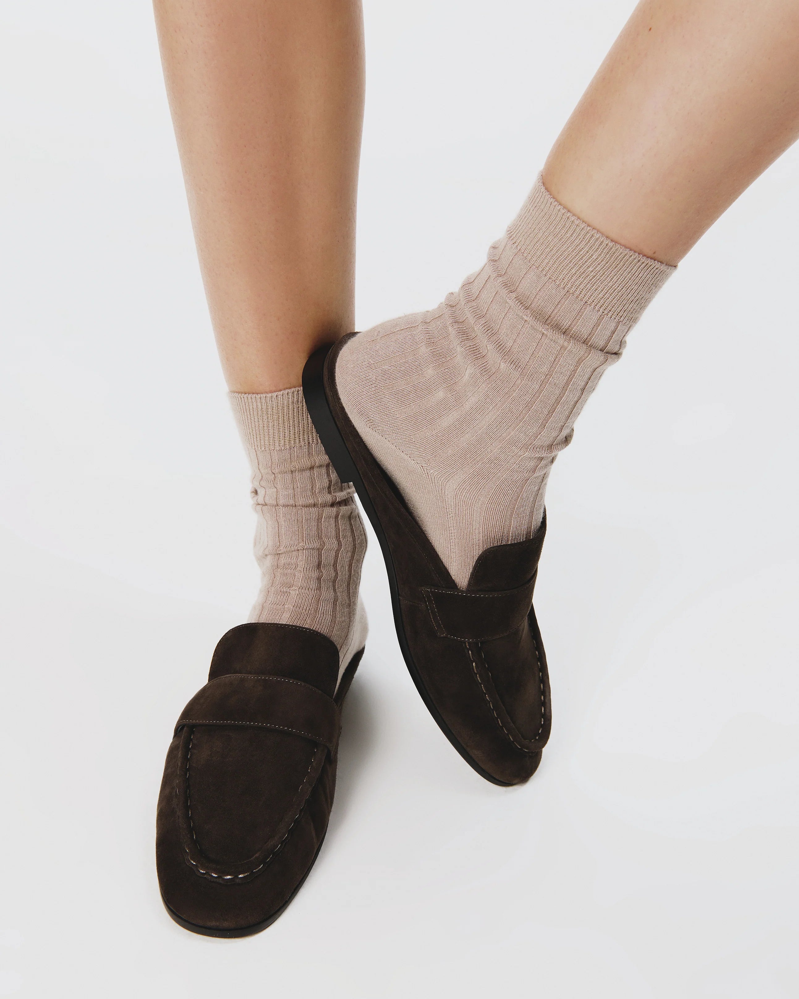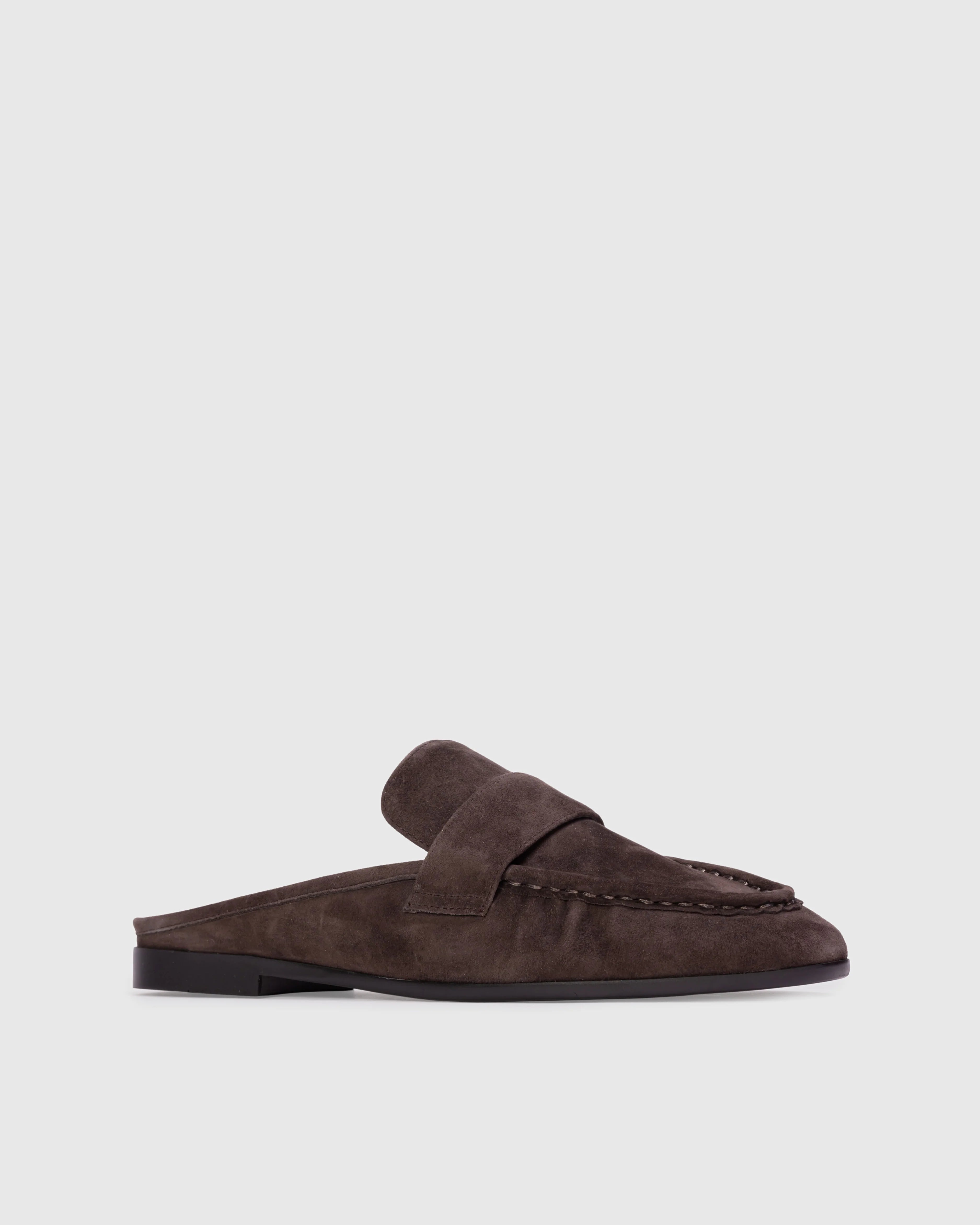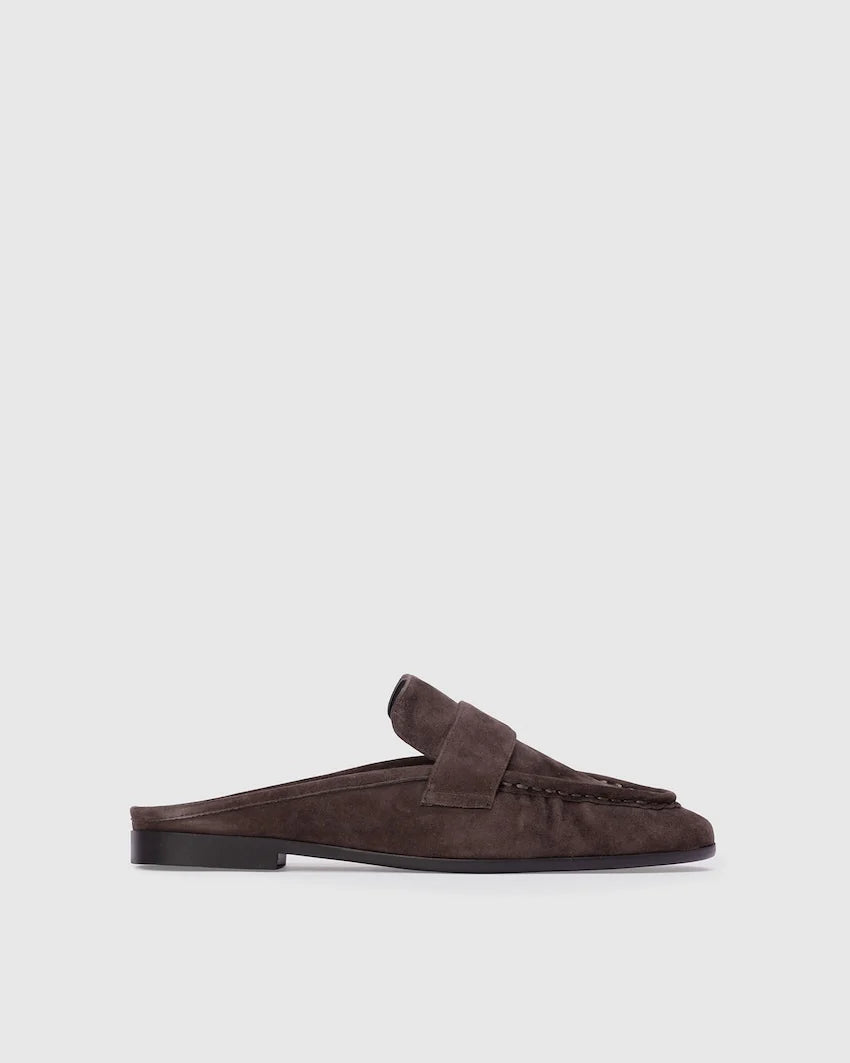 Classic round toe backless slip on loafer. Made with smooth buffed baby calf leather.