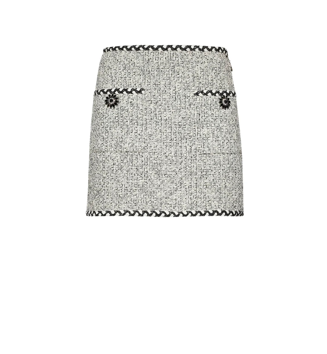 Short skirt with a sophisticated taste, characterized by a richly textured surface and refined contrasting decorative details that define the design. The refined finishes and the balance of the proportions express a contemporary elegance, ideal for luxury looks with a strong and feminine character.