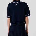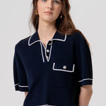 Knitted polo cropped. Classic cut neck, jewel buttons, flap and short sleeves