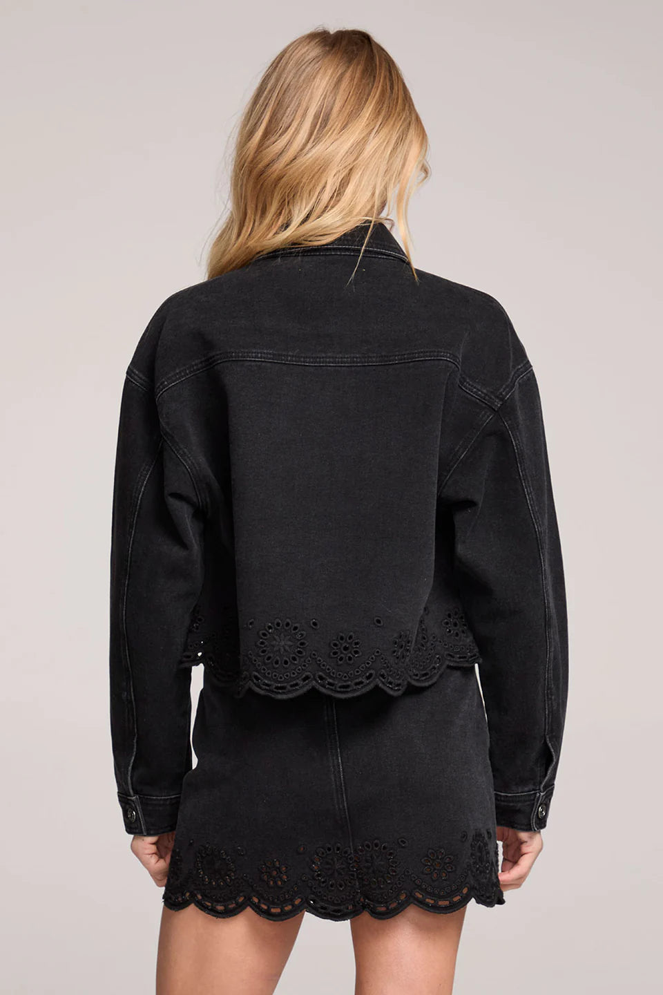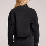 The Perrin Jacket is a cropped black jean jacket with a chic, boxy fit.